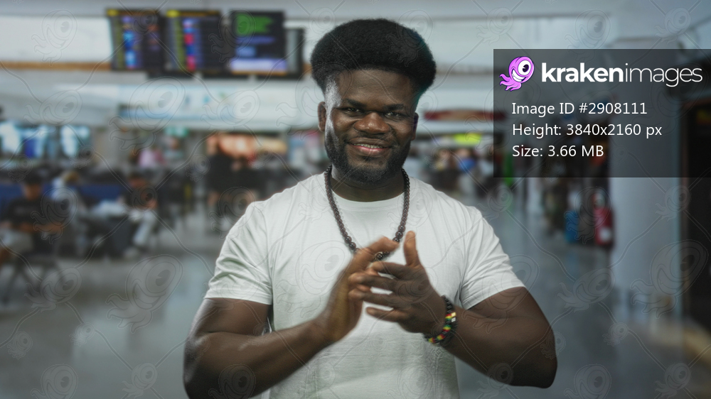 Young man clapping hands in airport terminal among travelers and flight information displays;joy celebration travel anticipation.