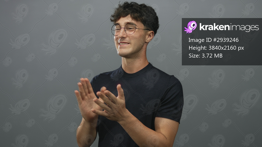 Young man clapping hands while smiling, wearing round glasses and black tee in a gray studio, short curly hair visible; joy celebration.