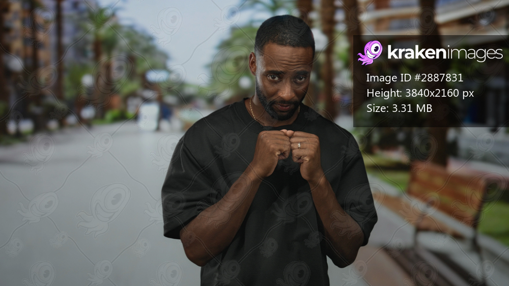 Young man with clenched fists near his chin on a city street lined with benches and palm trees; resilience determination.