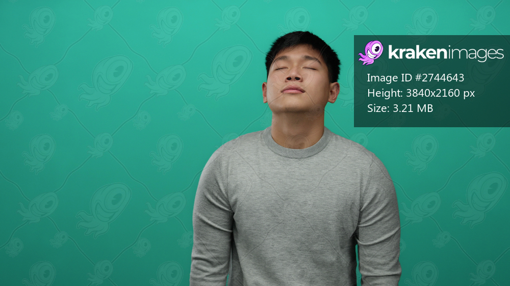 Young man with closed eyes wearing gray sweater against green background expressing tranquility and contentment in a minimalist setting.