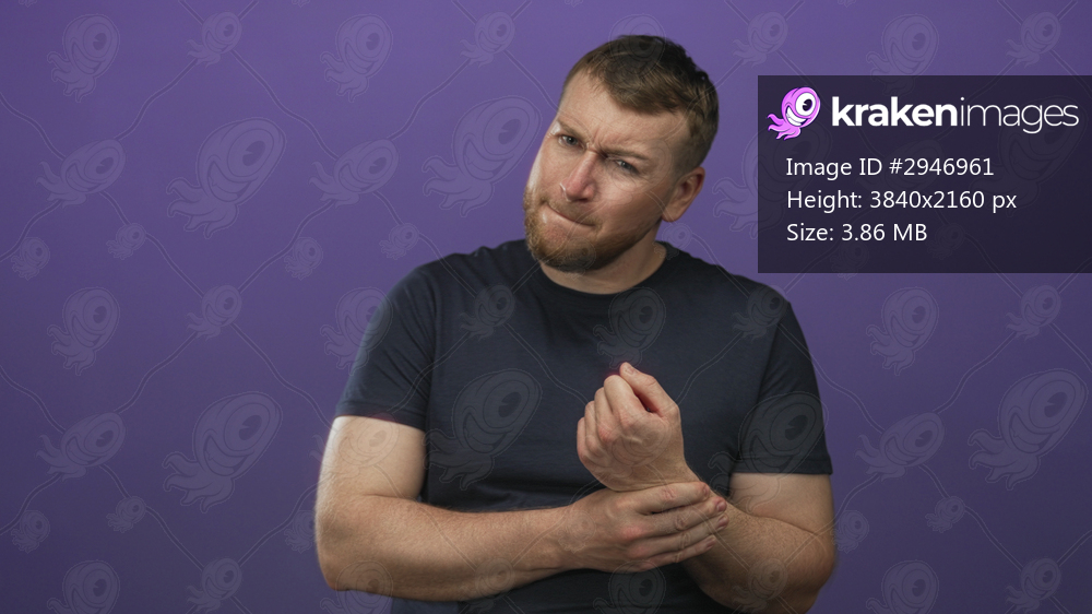 Young man clutching his wrist and wincing with visible hand pain in a studio against a deep purple backdrop; pain recovery treatment.