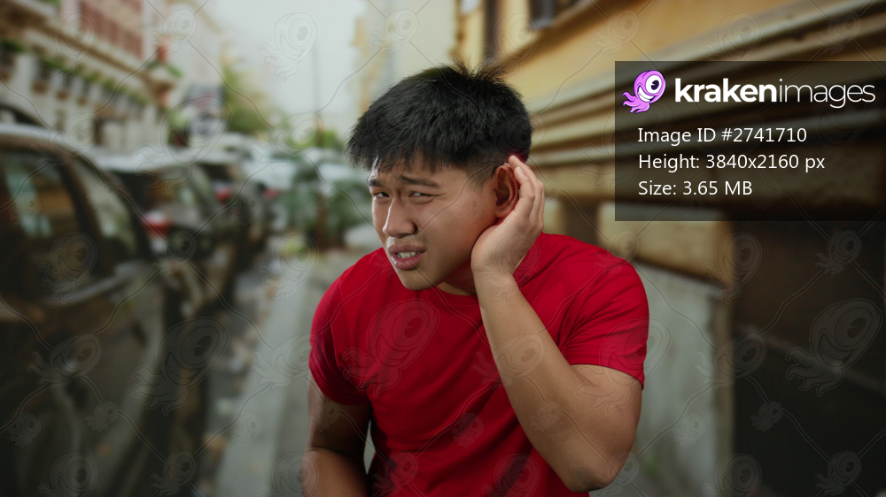 Young man communicating expressively on a lively city street, captured in an urban outdoor setting.