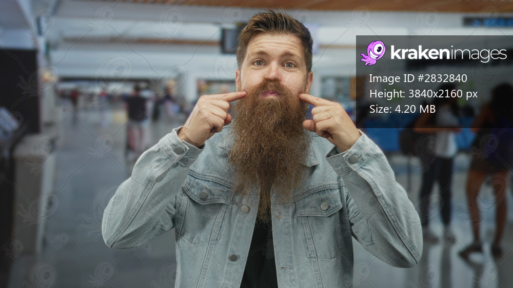 Young man confidently points index fingers to beard while smiling broadly in airport terminal; playfulness.