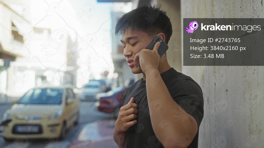 Young man confidently talks on smartphone while leaning against a city building wall, surrounded by parked cars and bustling street life in bright urban environment - Kraken Images