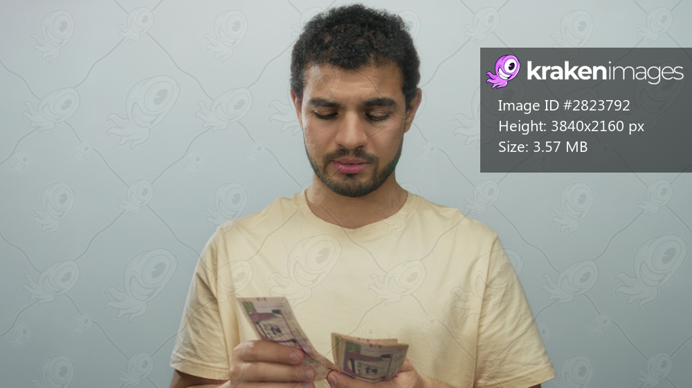 Young man counting and sorting riyal banknotes in a studio against a pale grey wall; financial anxiety.