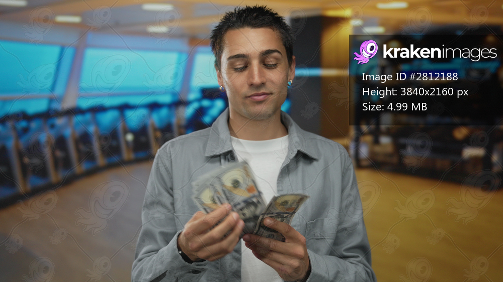 Young man counting united states dollar banknotes indoors in a gym setting, highlighting financial success and personal empowerment in an active lifestyle environment. - Kraken Images