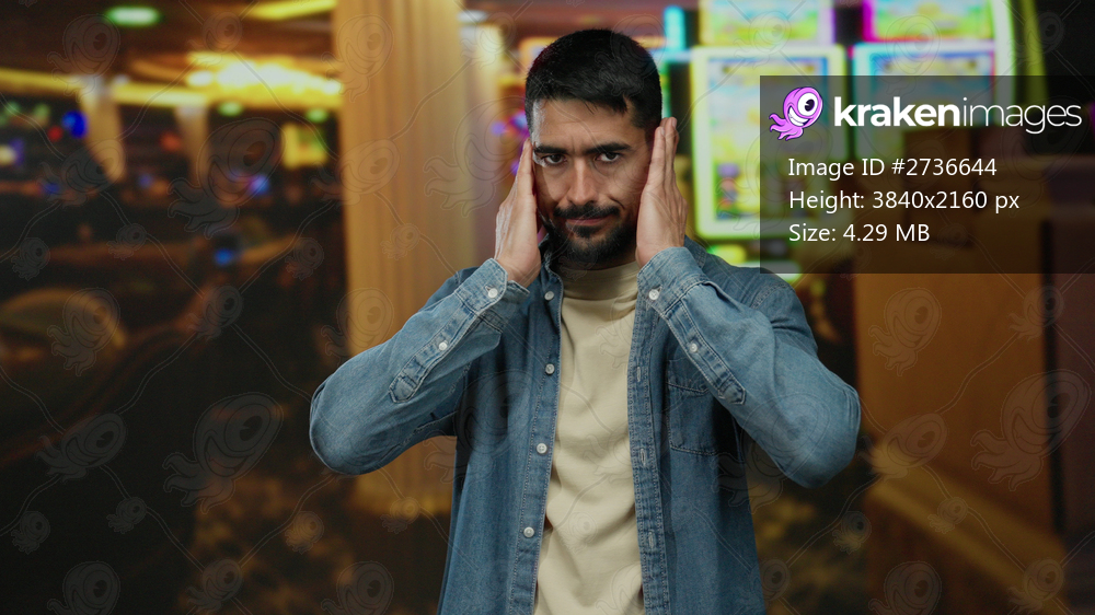 Young man covering ears in bustling casino with slot machines, expressing discomfort with noise, showcasing a handsome hispanic appearance, wearing denim indoors. - Kraken Images