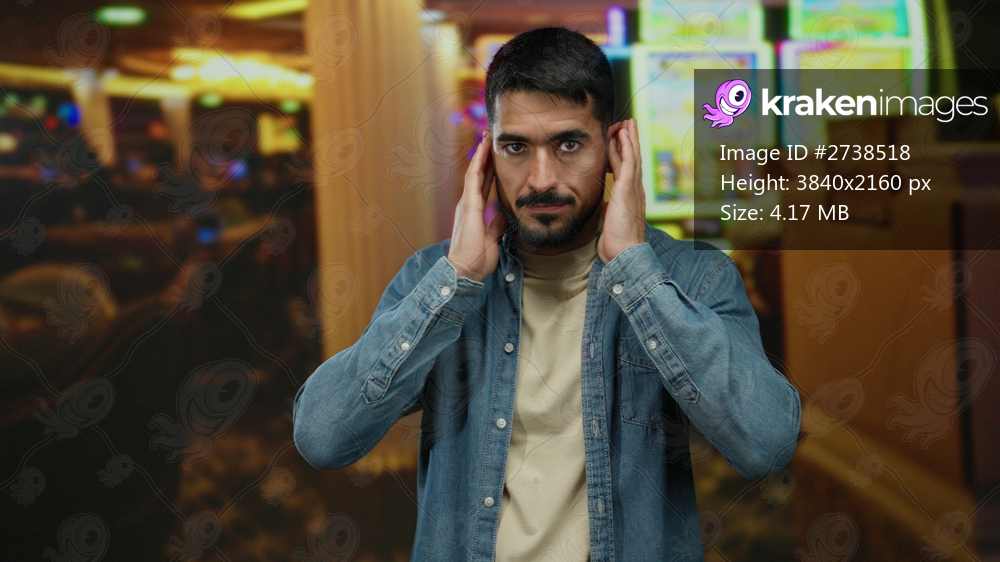 Young man covering ears in bustling casino with slot machines, expressing discomfort with noise, showcasing a handsome hispanic appearance, wearing denim indoors. - Kraken Images
