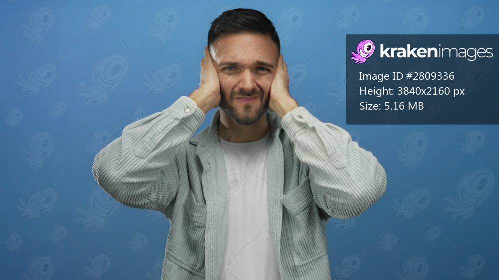Young man covering ears in frustration against a solid blue background, expressing discomfort and stress, dressed in casual attire.