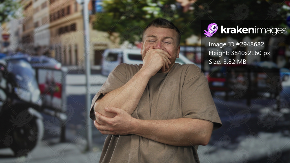 Young man covering mouth with hand and grasping elbow while laughing by a city street storefront, outdoors; awkward amusement.