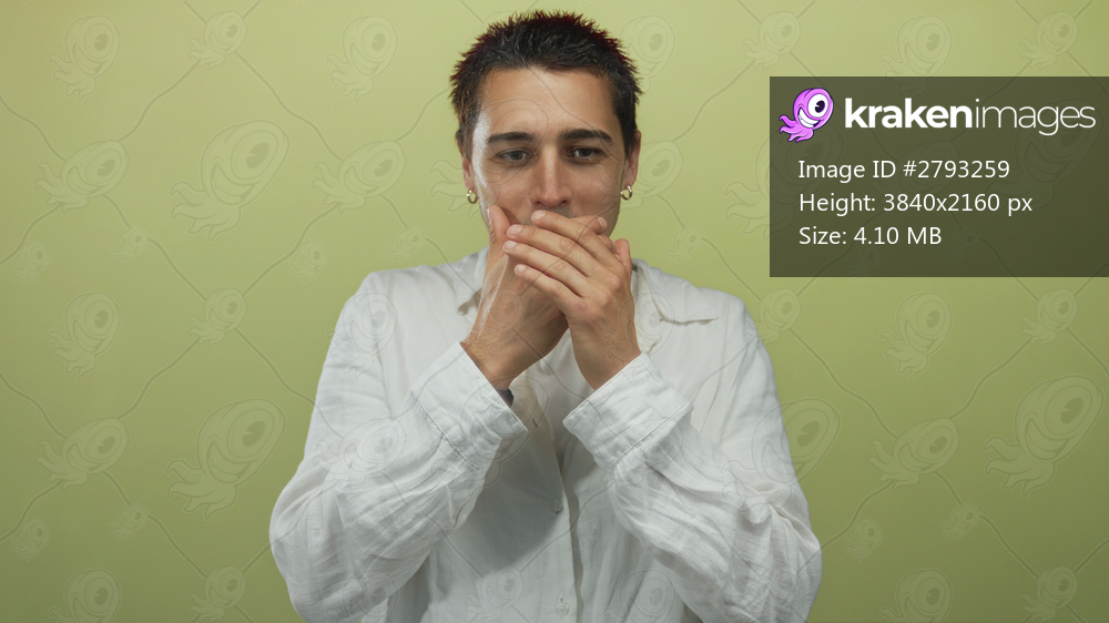 Young man covering mouth with hands over isolated yellow background wearing white shirt showing surprise and curiosity