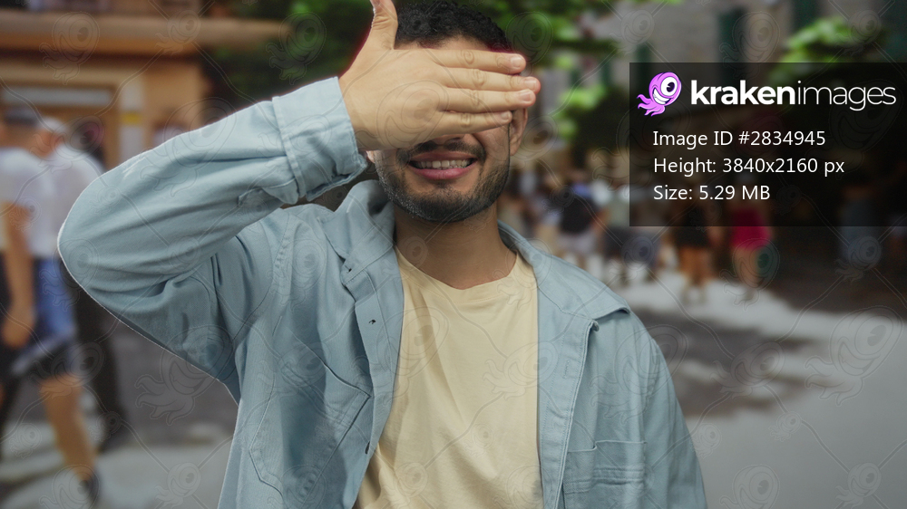Young man covers eyes with hand on bustling street while smiling; mystery playfulness curiosity privacy.