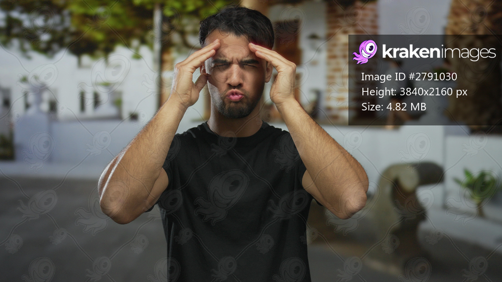 Young man covers face with hands on a city street, showcasing emotions in an outdoor urban setting with buildings in background.