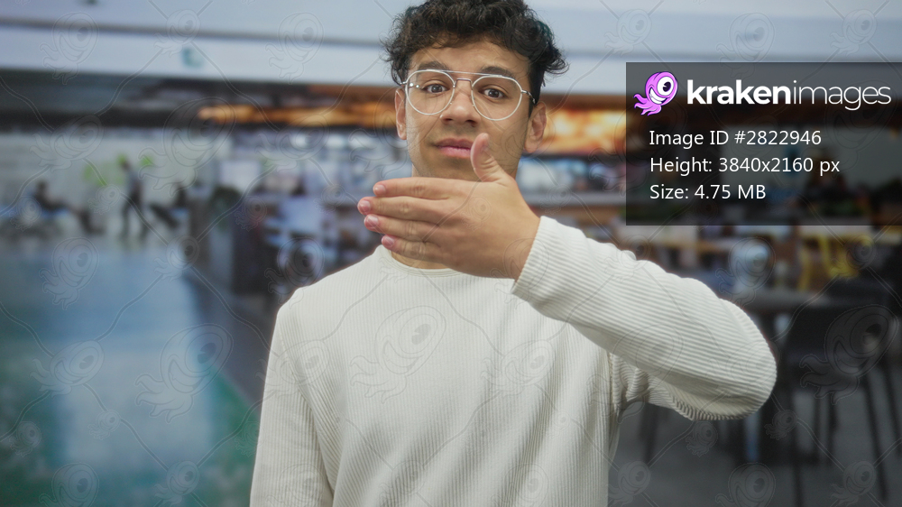 Young man covers his face with one hand while standing inside a busy airport terminal; embarrassment.