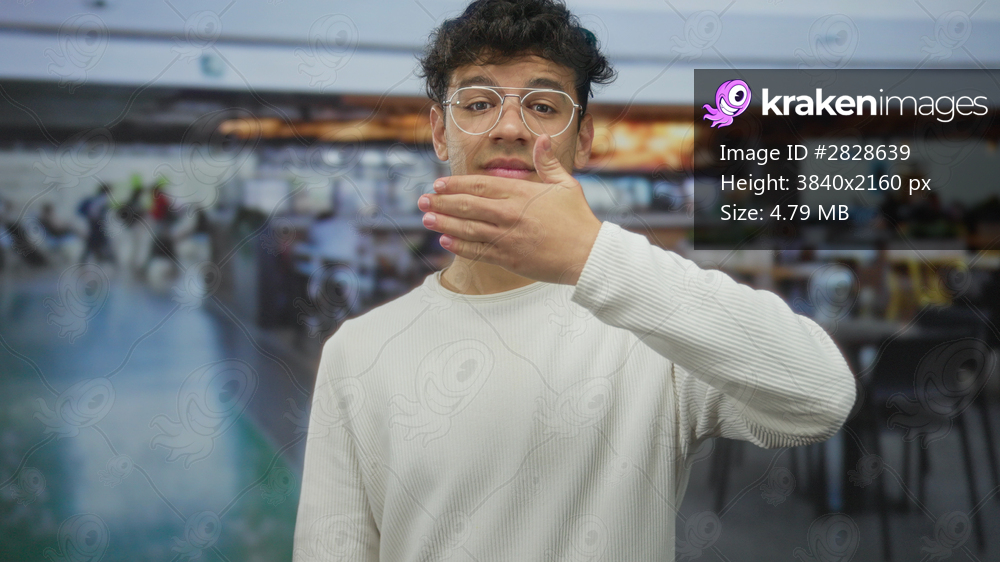 Young man covers his face with one hand while standing inside a busy airport terminal; embarrassment.