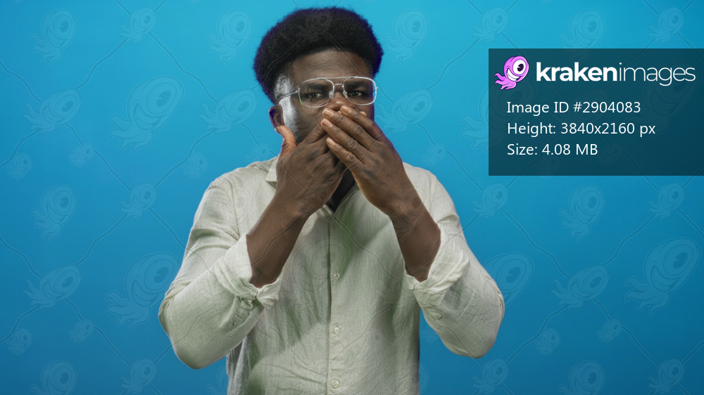 Young man covers mouth with both hands, wearing glasses and a light shirt against a blue studio wall; restraint surprise.