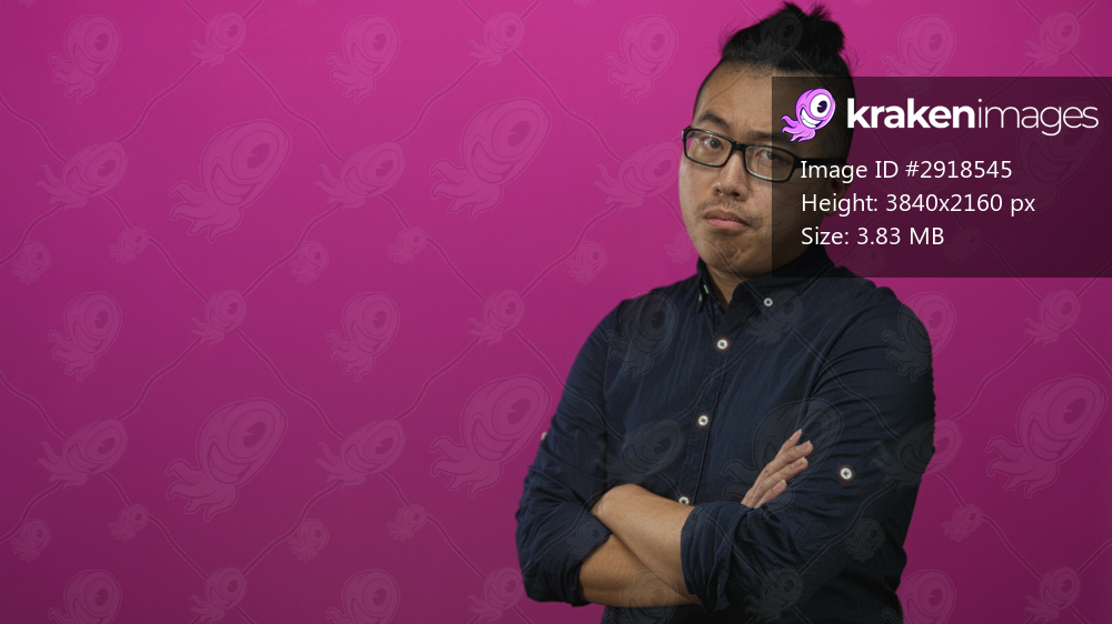 Young man with crossed arms and glasses in studio wearing navy shirt with rolled sleeves against pink backdrop; quiet confidence.
