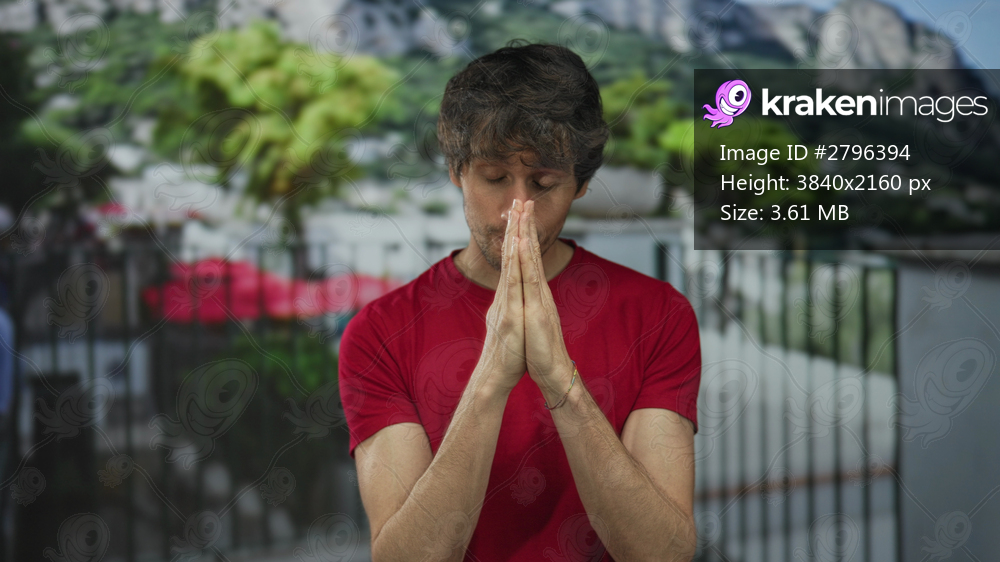 Young man crossing fingers on hands on sunlit street by metal railing and stone building in mountain town; hope belief faith chance.