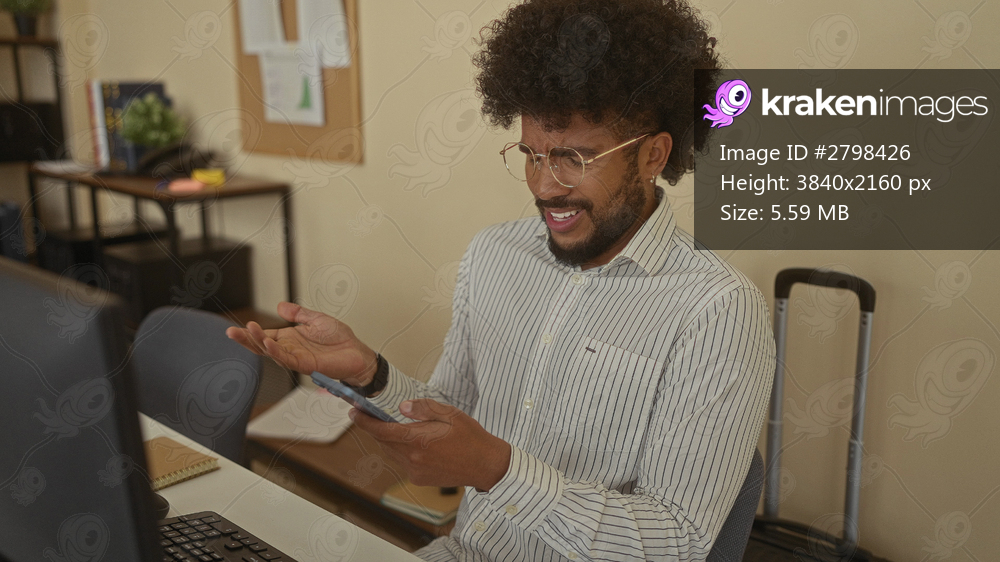 Young man with curly hair using smartphone at desk in modern office, surrounded by plants and documents, capturing a casual and focused workday environment. - Kraken Images