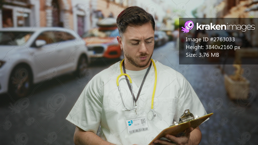 Young man doctor with beard and stethoscope standing outdoors on a city street holding a clipboard, representing urban healthcare and medical professionalism. - Kraken Images
