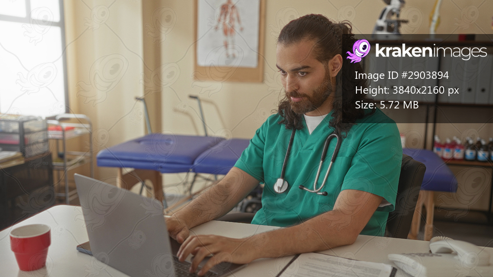 Young man doctor in green scrubs with stethoscope typing on laptop at clinic desk, reviewing notes; professional care focused.