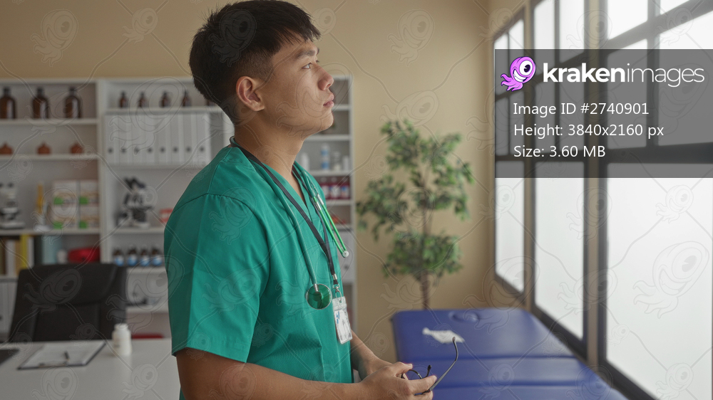 Young man doctor in green uniform stands indoors in a hospital clinic room holding glasses thoughtfully gazing out the window in a professional medical setting. - Kraken Images