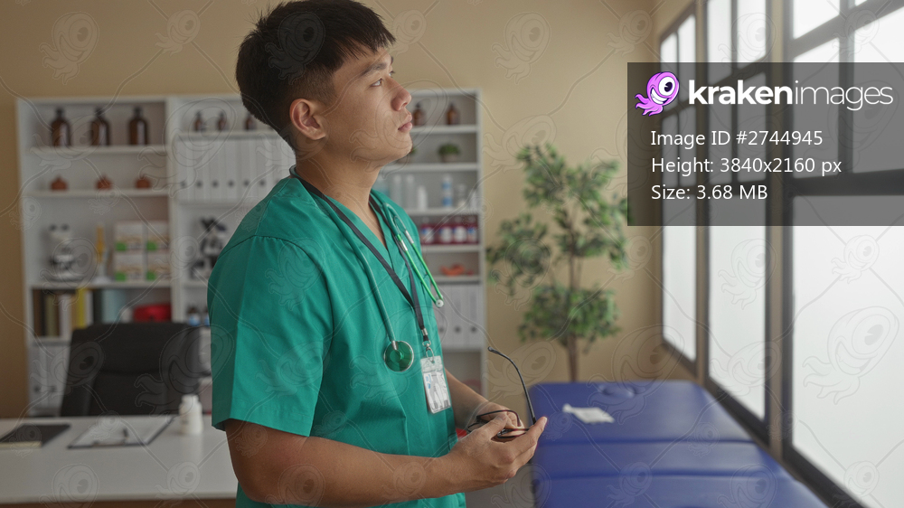Young man doctor in green uniform stands indoors in a hospital clinic room holding glasses thoughtfully gazing out the window in a professional medical setting. - Kraken Images