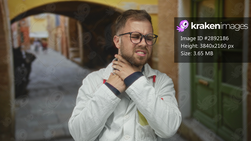 Young man doctor in white coat with stethoscope pressing his neck in pain on old town street; acute throat pain.