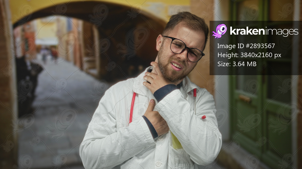 Young man doctor in white coat with stethoscope pressing his neck in pain on old town street; acute throat pain.