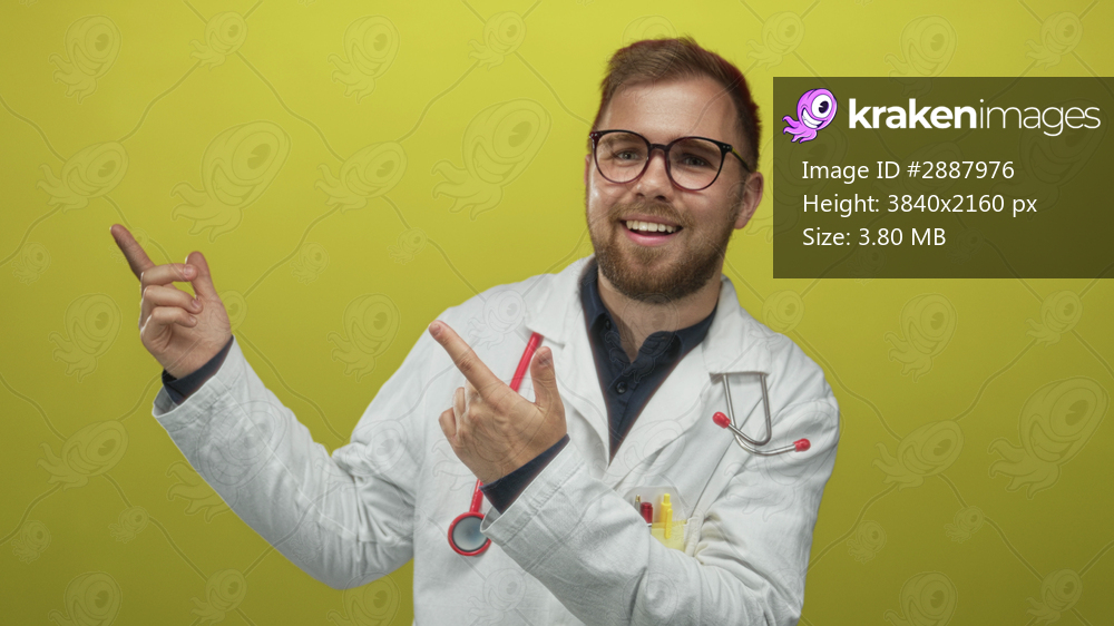 Young man doctor with stethoscope gesturing with both hands in studio against a yellow wall; friendly reassurance.