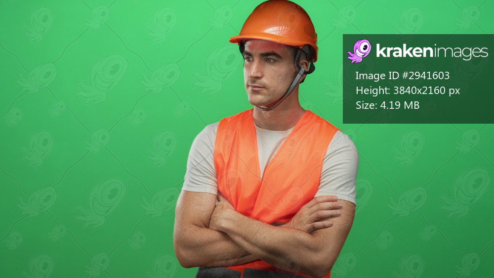 Young man engineer wearing orange hardhat and safety vest with crossed arms and headset in green studio; confidence duty.