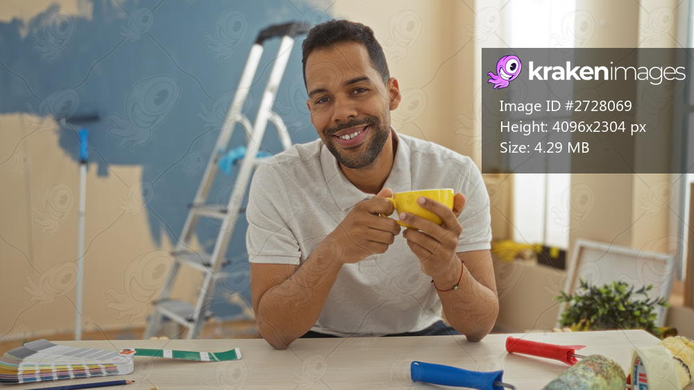 Young man enjoying coffee indoors amidst home renovation with paint supplies and ladder in background conveying warmth and creativity in new apartment setting - Kraken Images