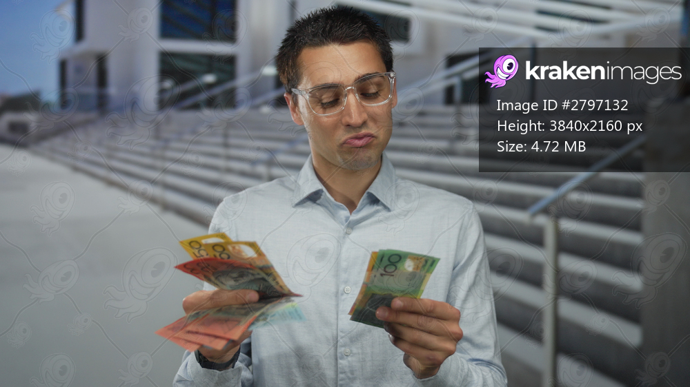 Young man examines australian banknotes outdoors, showcasing money handling and finance concepts in a casual setting.