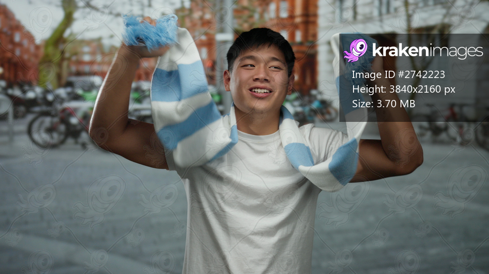 Young man excitedly holding a blue and white scarf outdoors in a bustling city street setting with parked bikes and blurred background buildings visible. - Kraken Images