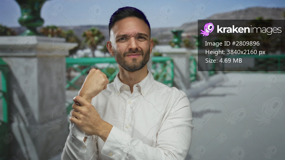 Young man experiencing wrist pain outdoors in an urban area, seemingly uncomfortable while standing on a sunny street with palm trees and mountains in the background. - Kraken Images