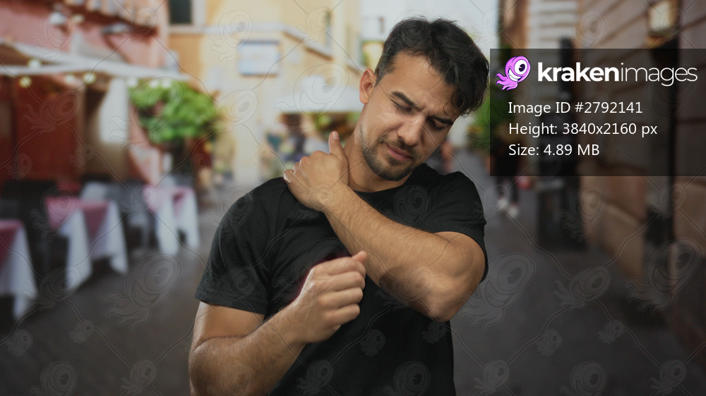 Young man expressing discomfort on a bustling city street, surrounded by blurred urban scenery, capturing a moment of outdoor pain and interaction.