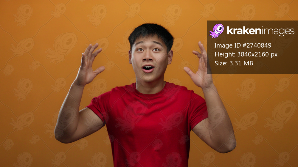 Young man expressing emotions against an isolated orange background, emphasizing excitement, determination, and joy, wearing a vibrant red shirt and showcasing powerful gestures. - Kraken Images