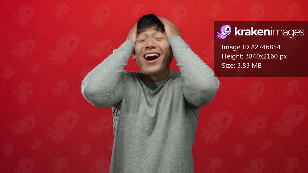 Young man expressing emotions with hands on head against an isolated red background wall.