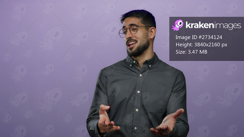 Young man expressing emotions in front of a purple background, wearing glasses and a dark shirt, captured in various gestures, highlighting his charisma and personality. - Kraken Images