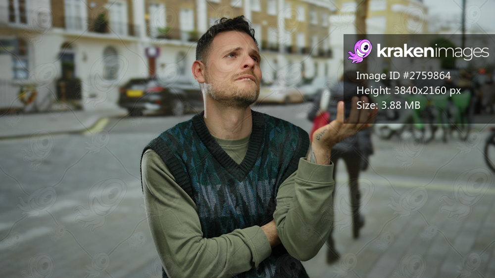 Young man expressing emotions on an urban street filled with people and bicycles.
