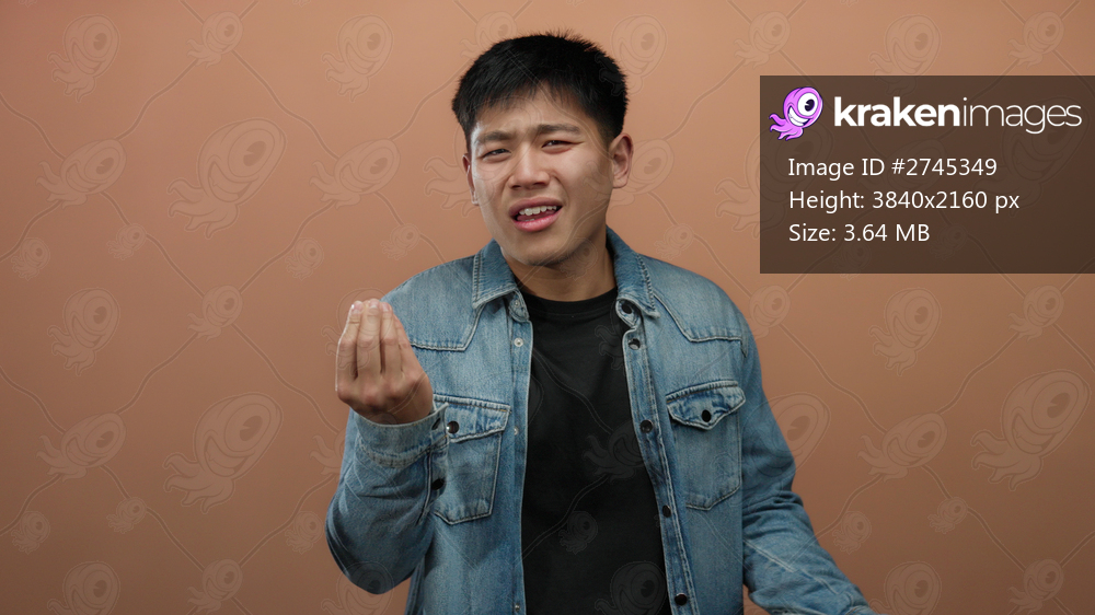 Young man expressing skepticism with hand gestures against an isolated brown wall background, conveying uncertainty and contemplation while wearing a casual denim jacket. - Kraken Images
