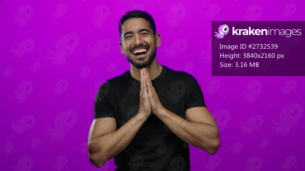 Young man expressing surprise against a vibrant pink background, displaying emotion with hands on head, wearing a black shirt, creating a captivating portrait of a hispanic male model. - Kraken Images