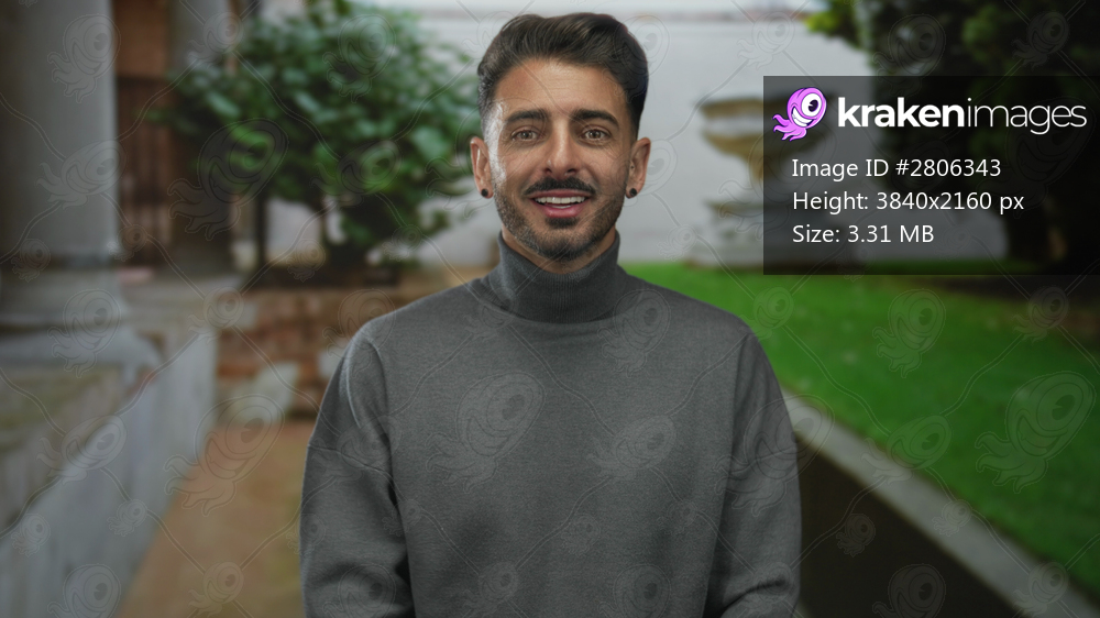 Young man face smiles toward camera near stone column in lush green park with blurred urn and foliage; joy.