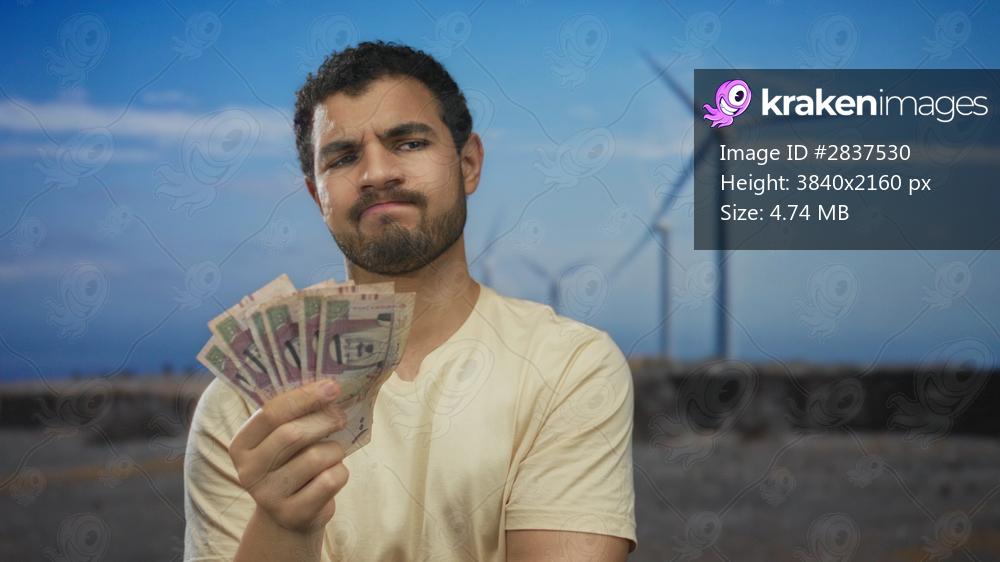 Young man fans saudi riyal banknotes with bare hand by windmill on street under clear blue sky; doubt.