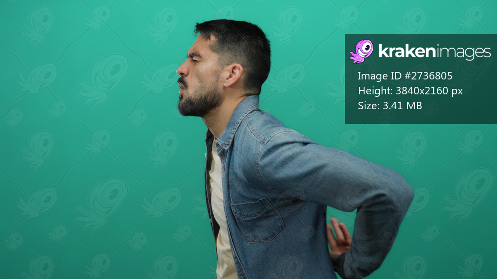 Young man feeling back pain in denim jacket against a green background showcasing discomfort and health concern