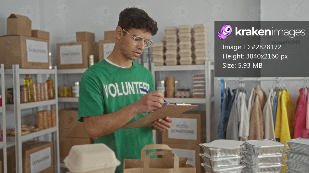 Young man fills logsheet with pen on clipboard beside stacked food donation boxes in building; compassion teamwork care support.