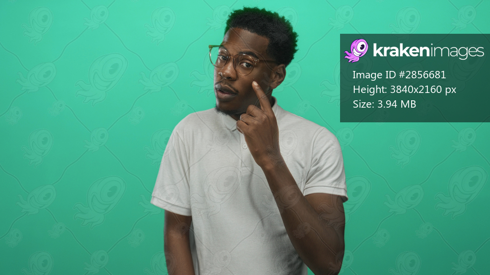 Young man finger pointing to eyeglasses in bright green studio set showcasing eyewear accessory; clarity focus.