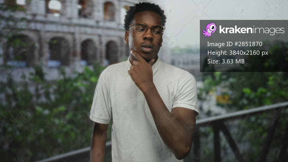 Young man finger pointing to sunlit roman coliseum building framed by green foliage and railing in outdoor scene; curiosity.