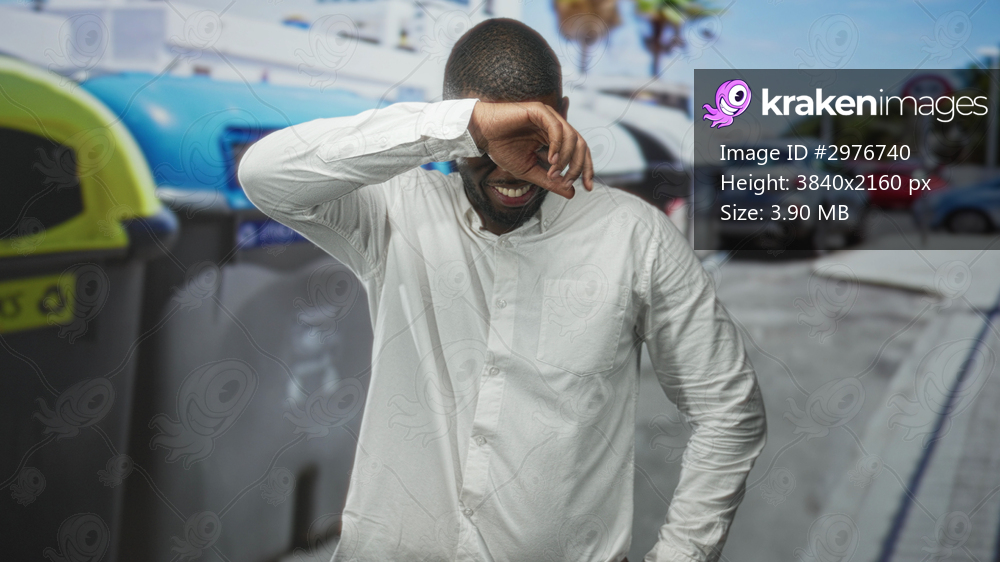 Young man with forearm covering eyes in white shirt, smiling and shielding face on street near bins and parked cars; amusement playfulness.