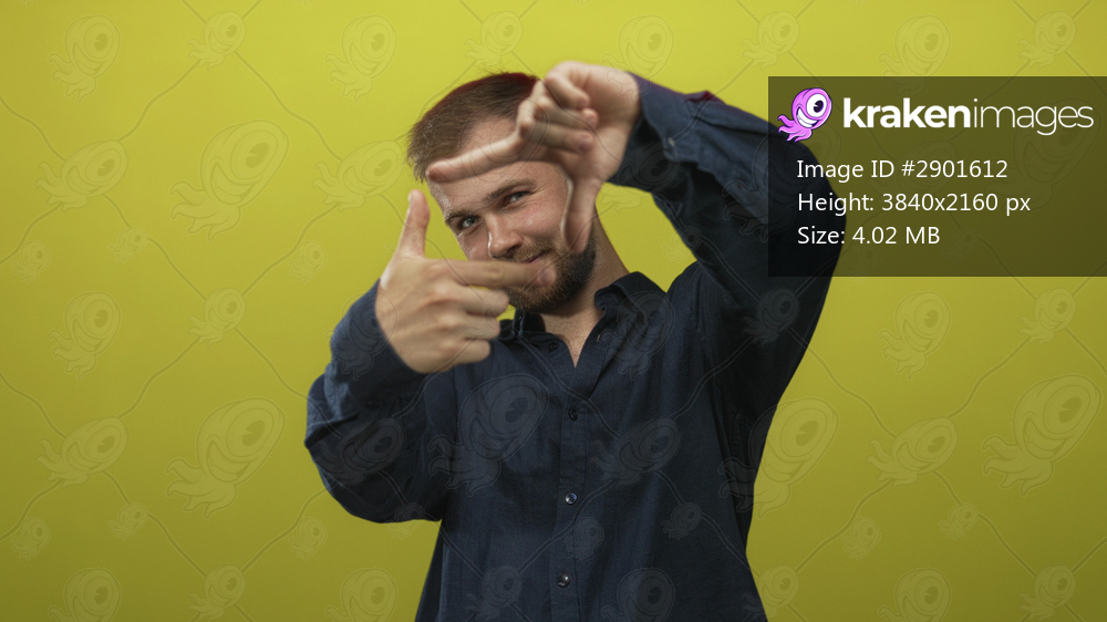 Young man framing face with hands in studio with lime green backdrop; playfulness creativity imagination.